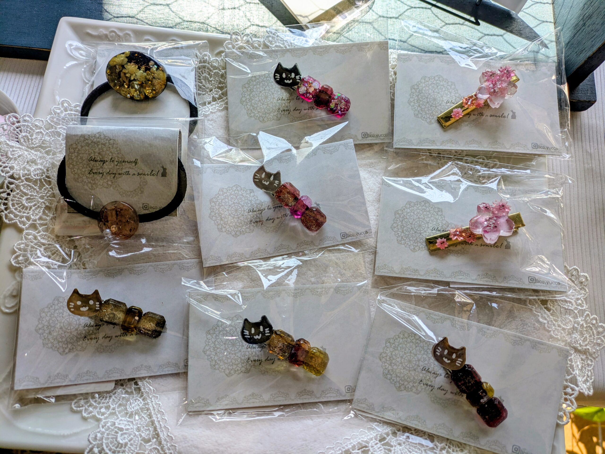 レジンのヘアピン、晴れた日にキラキラ